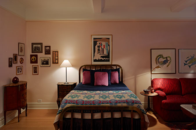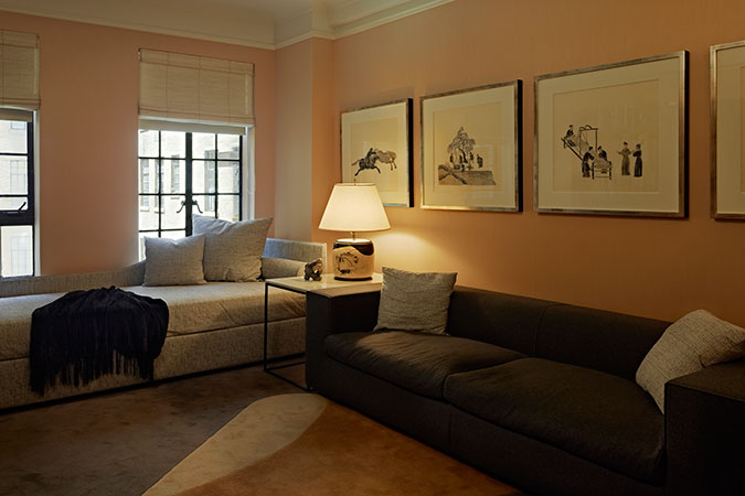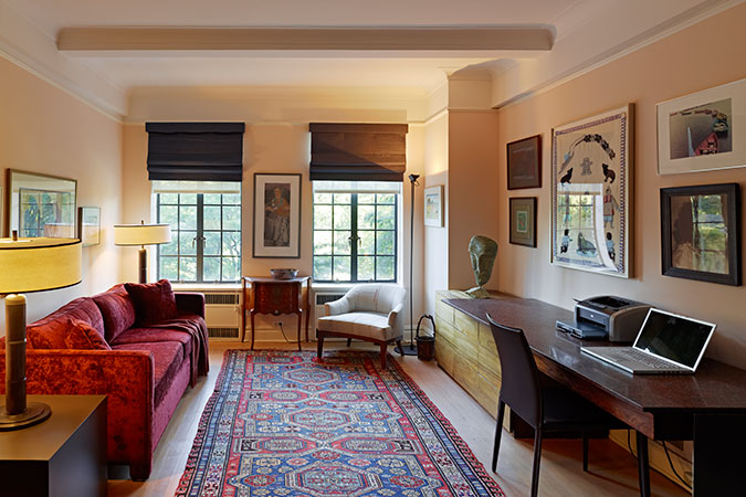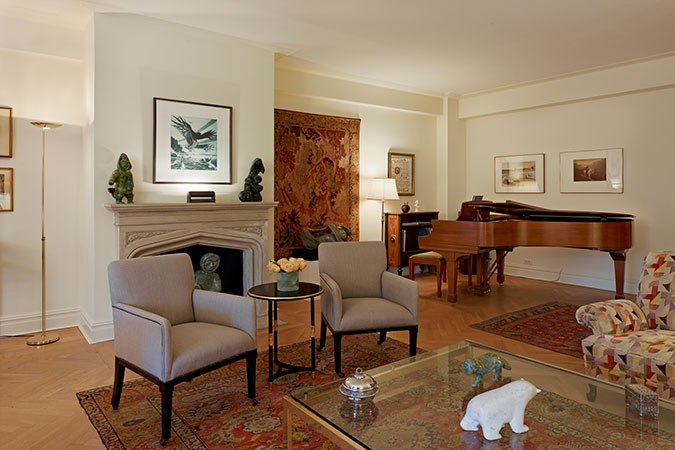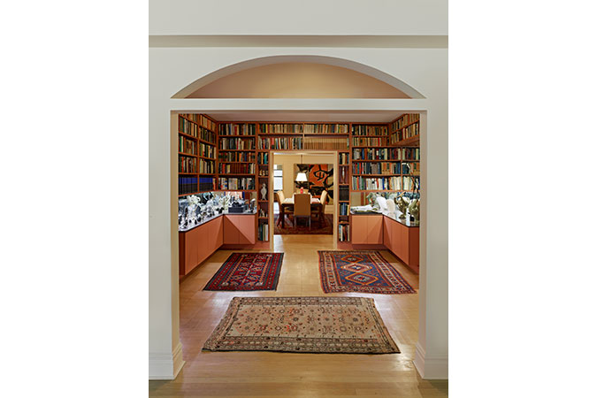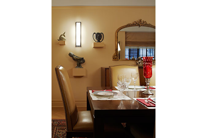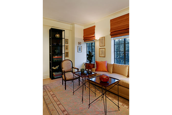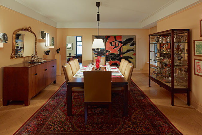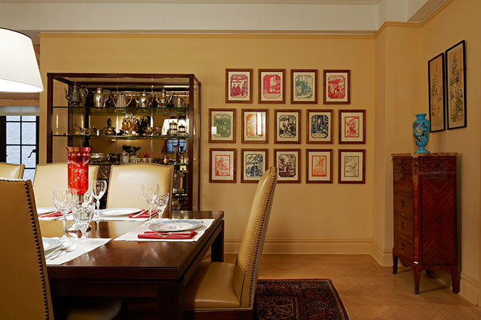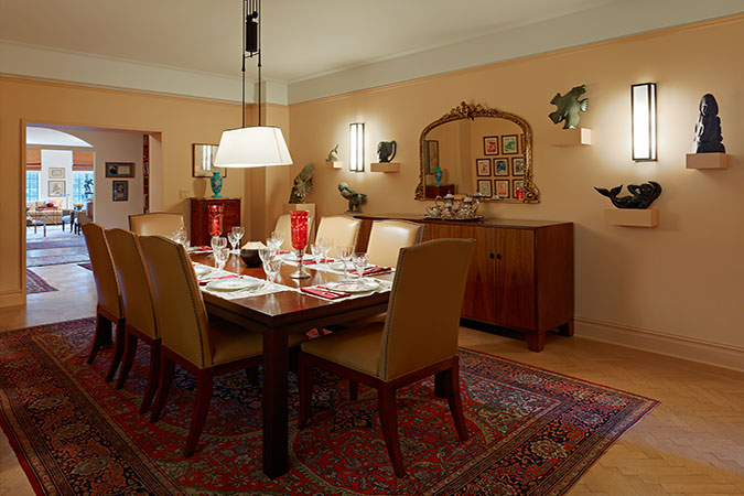 Harmoniously blending an extensive art collection from different cultures [Inuit sculptures and prints, Chinese prints, European prints, old and new tapestries], with furnishings that spanned generations and design styles, was both a challenge and a pleasure. Stories were grouped, vignettes were created and a lifetime of global treasure hunting was now elegantly displayed for all to enjoy with a Dutch pink paint color chosen as the unifying backdrop in the dining room. Custom window treatments and fabric selections provided subtle texture, Christian Liagre macassar bookcases created a tasteful vertical accent, and a Zylinder Zug brass chandelier added a practical and understated level of drama.
