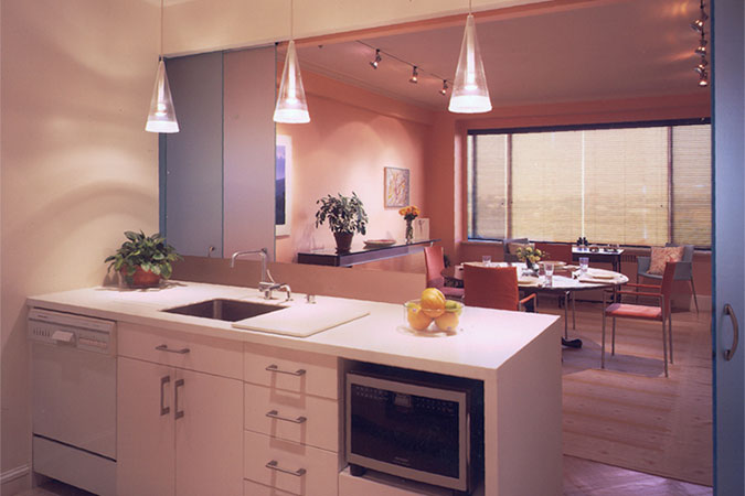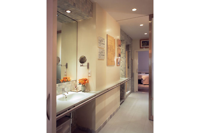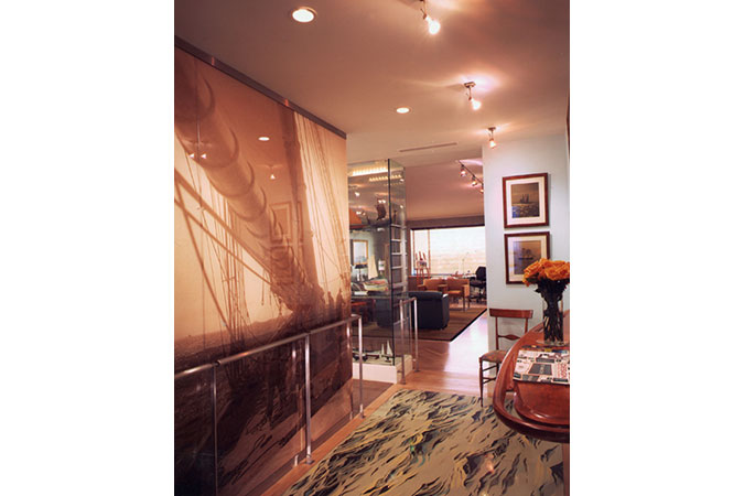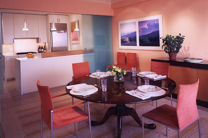 To graciously accommodate a couple with mobility issues, space configuration, circulation ease, and master bath/kitchen functionality became our primary focus. Seamless transitions between flooring materials and ergonomic furniture selections were incorporated to ensure safety and comfort. To take advantage of the marvelous light transmitted from both the east and west facing windows, we installed custom glass walls and display cases that showcased interesting collections, bathed the residence in warm natural glow, and made for interesting sight lines through the apartment.
