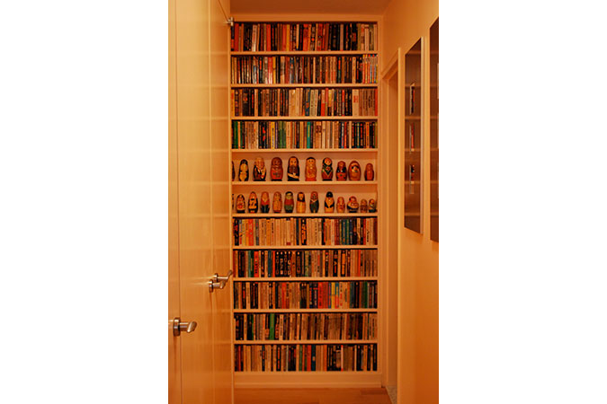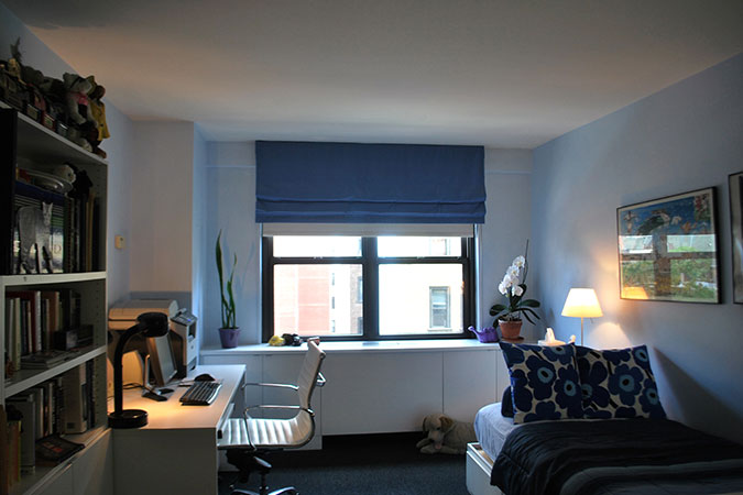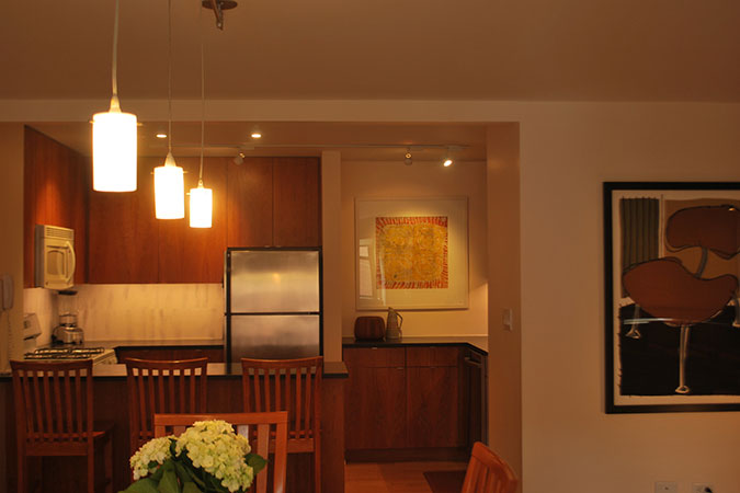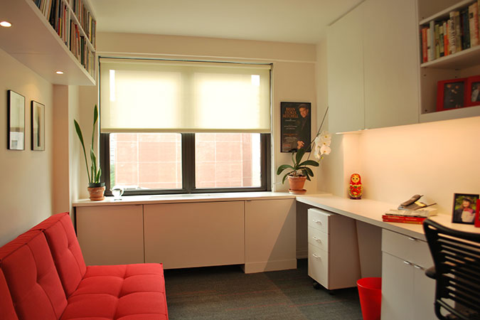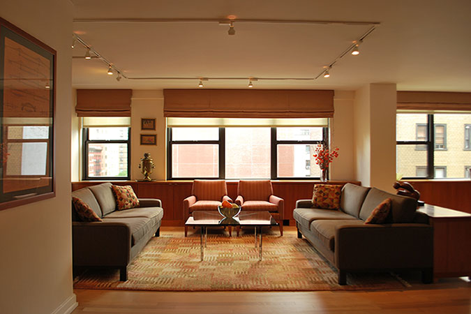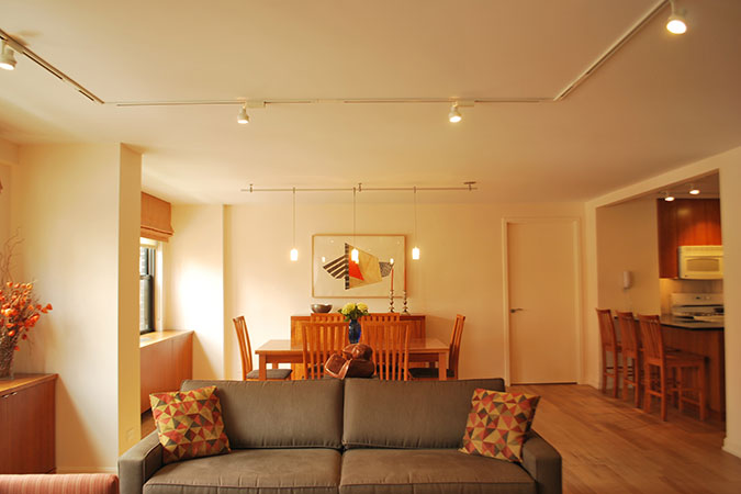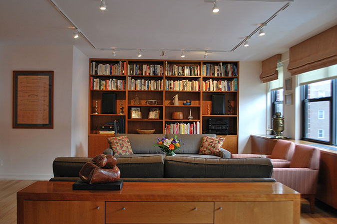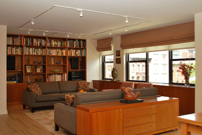 Two apartments that had been combined 10 years earlier were in need of "refreshing" -- this provided a golden opportunity to efficiently and cost effectively customize/modernize the space. Refinished floors in a lighter hue with sleek contemporary baseboards, new custom bookcases and cherry cabinetry, clean minimalist lighting throughout, new living room ensemble with patterned Tibetan rug as focal point...all told, for a modest budget the project achieved maximum results.