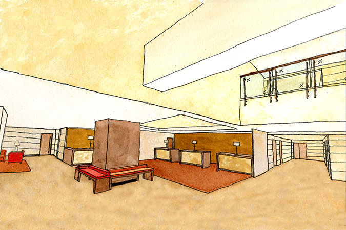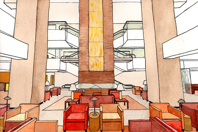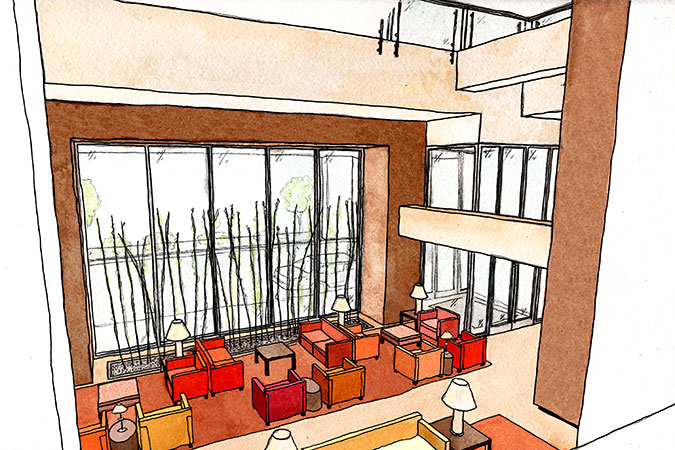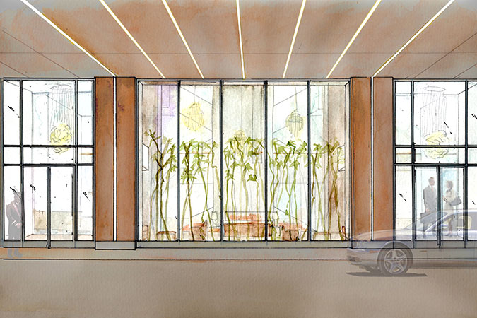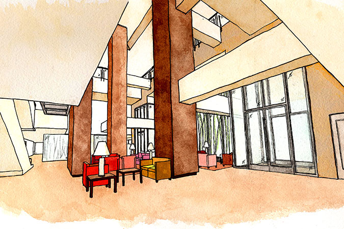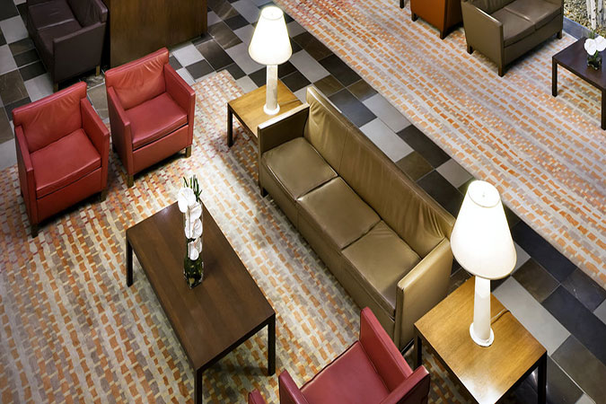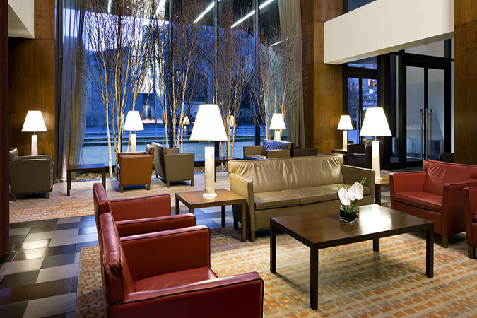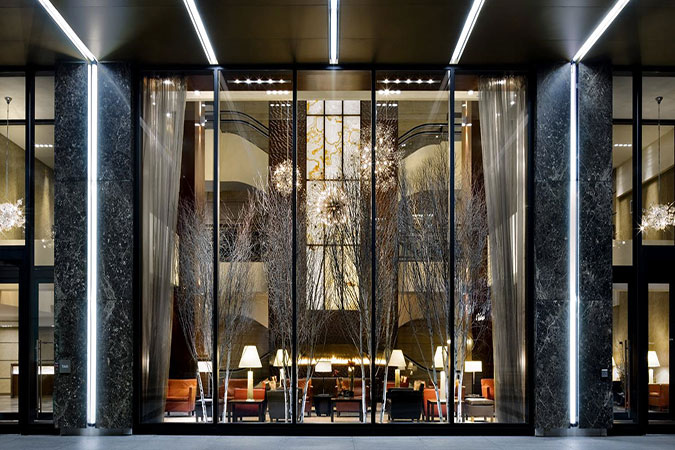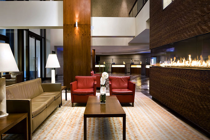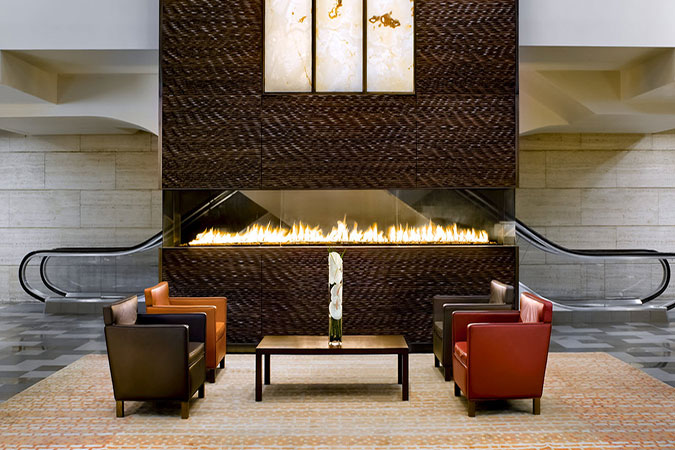 The transformation of the Westin Ottawa for Starwood began with a new continuous floor-to-ceiling glass curtain wall that simultaneously re-established the exterior sense of arrival and re-imagined the interior lobby space. With a 3-story custom fireplace as the centerpiece , more inviting finishes and atmospheric lighting [grey concrete walls recovered in richly veined marble, cold travertine flooring replaced with warm tones of taupe and brown suede limestone, columns clad in walnut, and alabaster back lit panels], greeted visitors with modern sophistication and a touch of the theatrical -- all culminating with one-of-a-kind crystal chandeliers designed to mimic a fireworks display.
